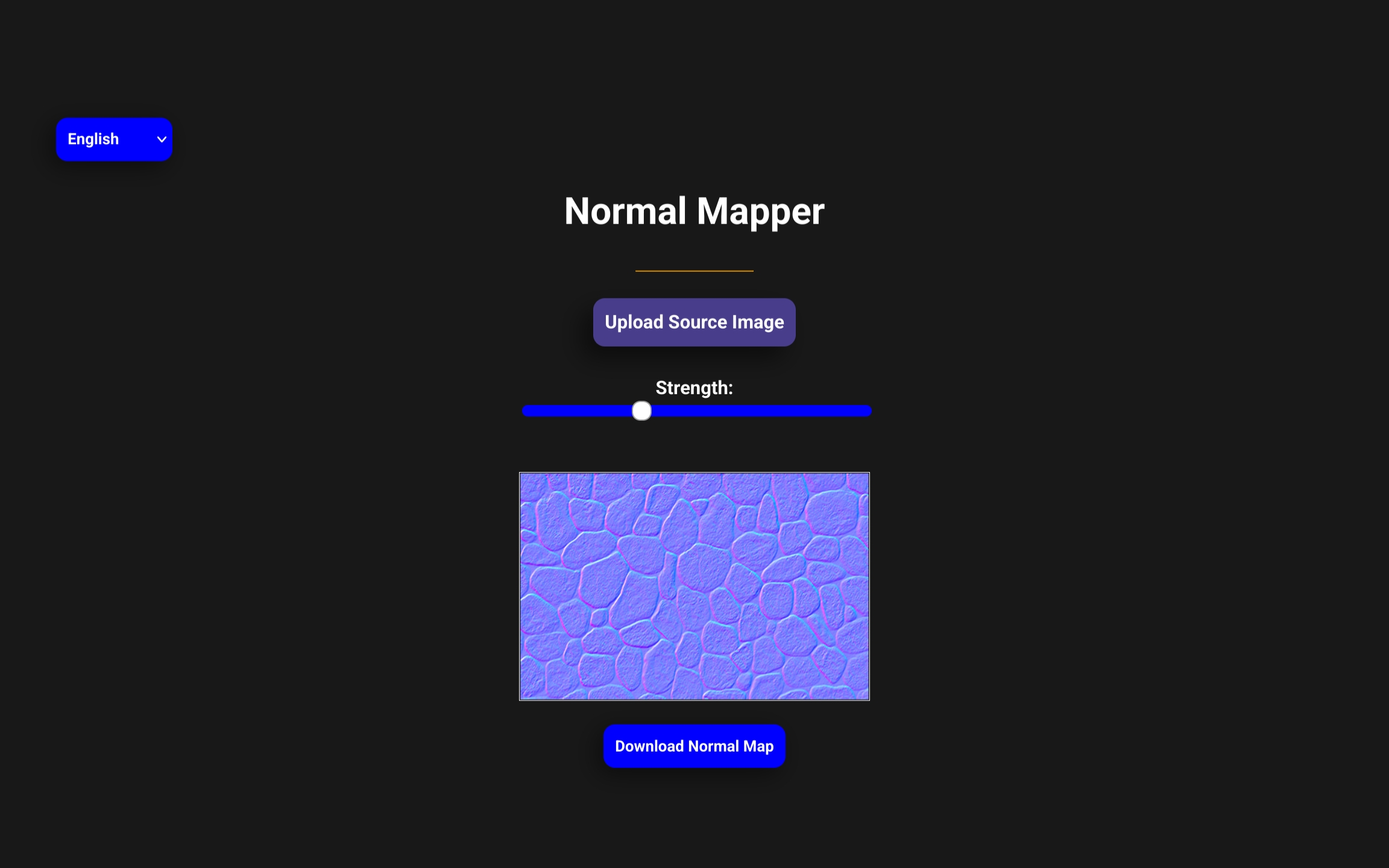 Hit the "Upload Source Image" button, select an image from the popup, adjust the normal strength to perfection, then click the "Download Normal Map" button!